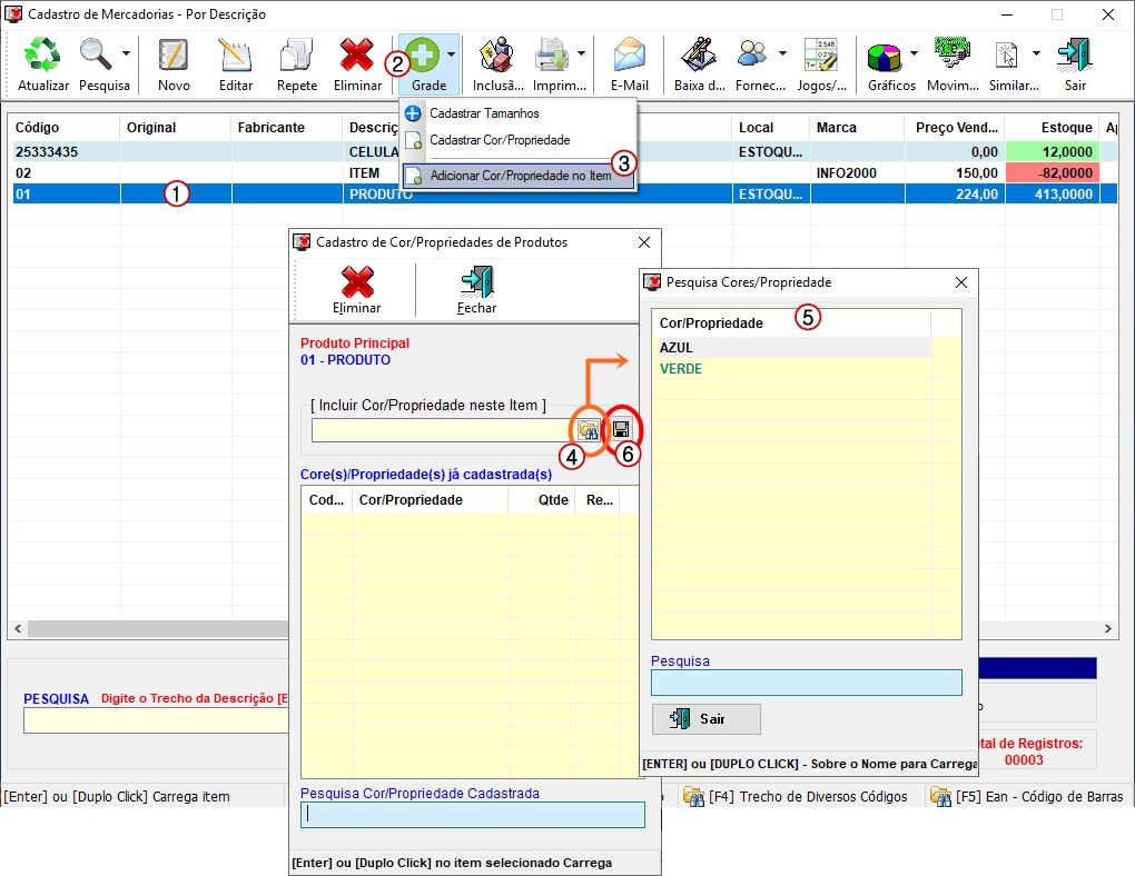 opção [3. Adicionar Cor/Propriedade no Item].