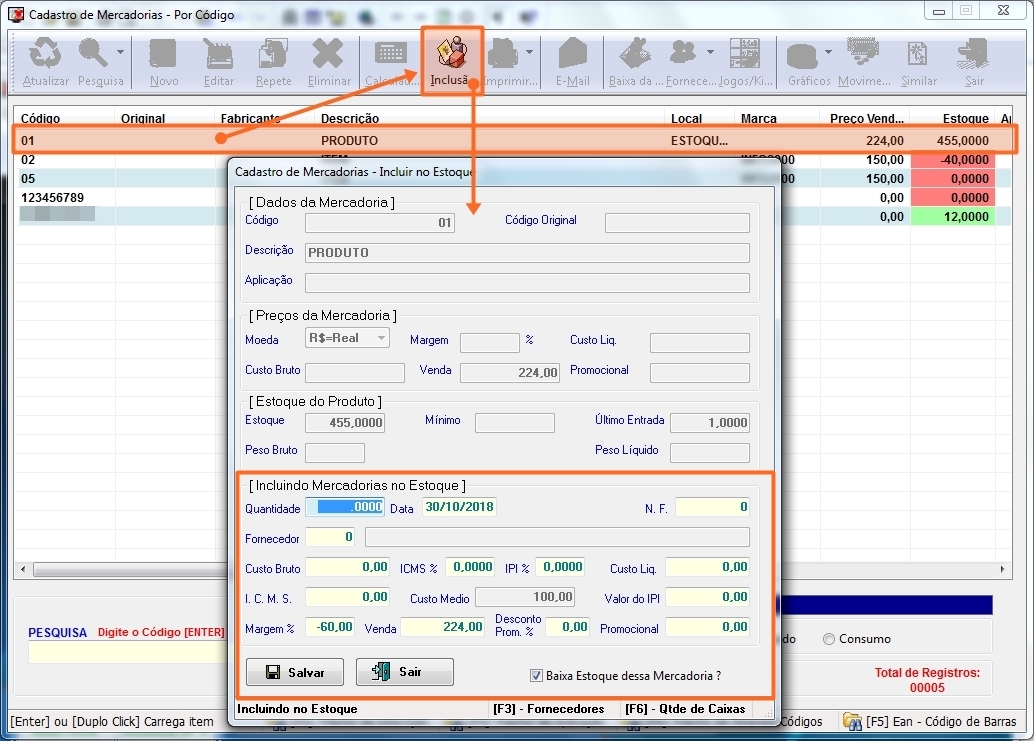 incluir no estoque, selecione o item e clique no botão [INCLUSÃO],