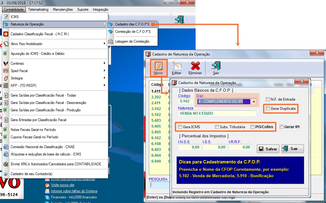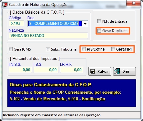 Cadastro das CFOP's: