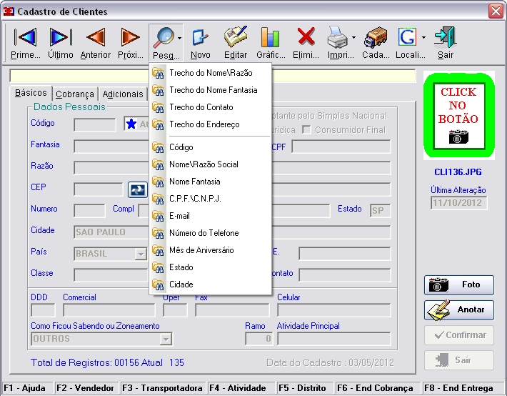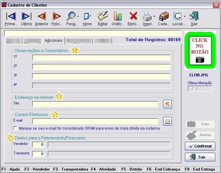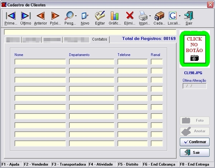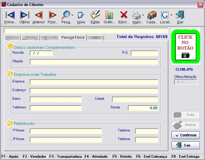 funções [F2] - Vendedor, [F3] - Transportadora, [F4] - Atividade, [F5] - Distrito e [F6] - End de Cobrança, o [F1] - Ajuda irá listar mais algumas