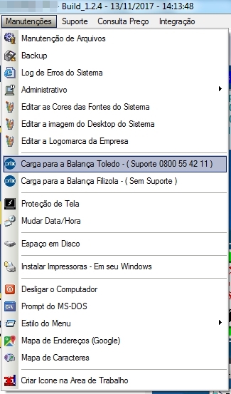 Acesse o menu Manutenções > Carga para Balança Toledo - (Suporte 0800 55 42 11);