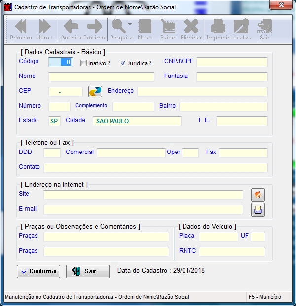 Cadastro. Pressione [ ENTER ] com ou sem o número da transportadora e