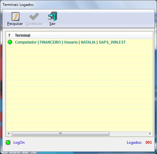 Você poderá visualizar os terminais logados, clicando no opção [VER TERMINAIS LOGADOS]; Você verá uma janela mostrando todos os terminais LogOn e LogOff;