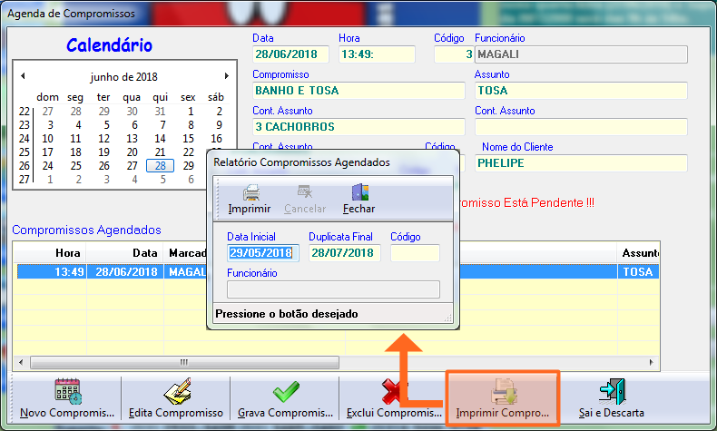 Imprimir Compromisso: Clique no botão [IMPRIMIR] e em seguida aparecerá uma janela, onde você poderá definir a Data Inicial e Final. Digite o código do Funcionário.