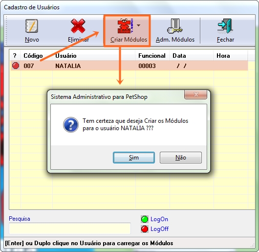 Para adicionar ou excluir os módulos, selecione o usuário e clique no botão [ADM. MODULOS]; Saiba mais na explicação abaixo: