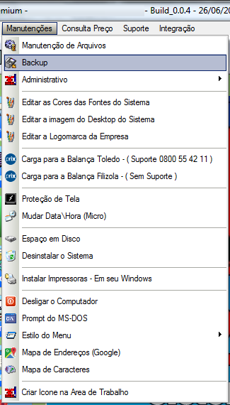 Inicialmente pelo menu MANUTENÇÕES -> BACKUP, como mostra a figura abaixo;