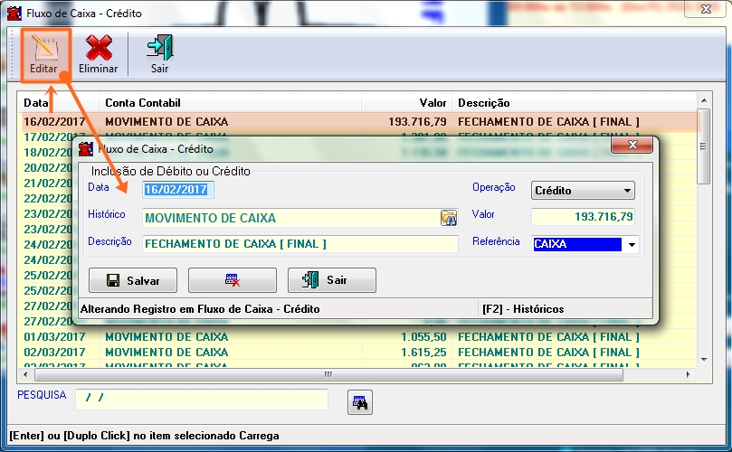 Caso queira editar, selecione-o e clique no botão [EDITAR], caso queria excluir um lançamento, selecione-o e clique no botão [ELIMINAR];